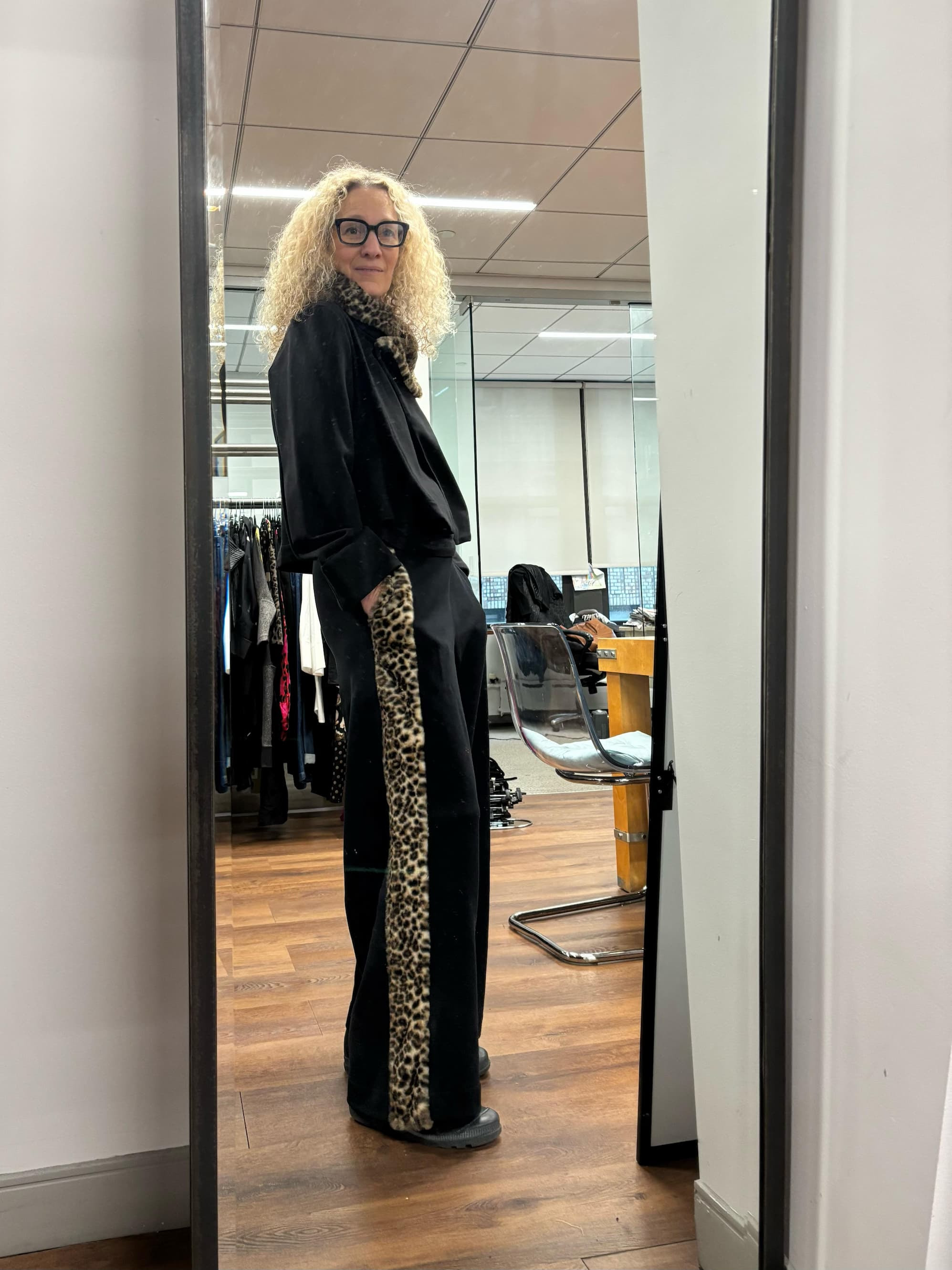Yael is wearing the wearing the Urban Snug Moto Jacket, Soft Knit Mockneck Tee, and Urban Strut Relaxed Pants