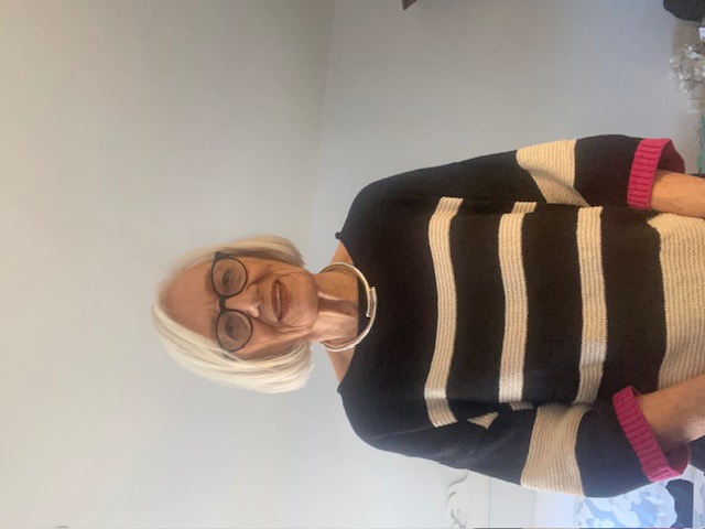 Natalie is wearing the Boxy Stripes Sweater in Black/Cream.