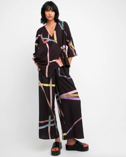 Urban Warsaw Cutout Tunic Top and Urban Stave Harem Pants, Zebra (left). Ozai N Ku Lounge Pants with Kimono Jacket (center). Ozai N Ku Ribbon Skirt (right).