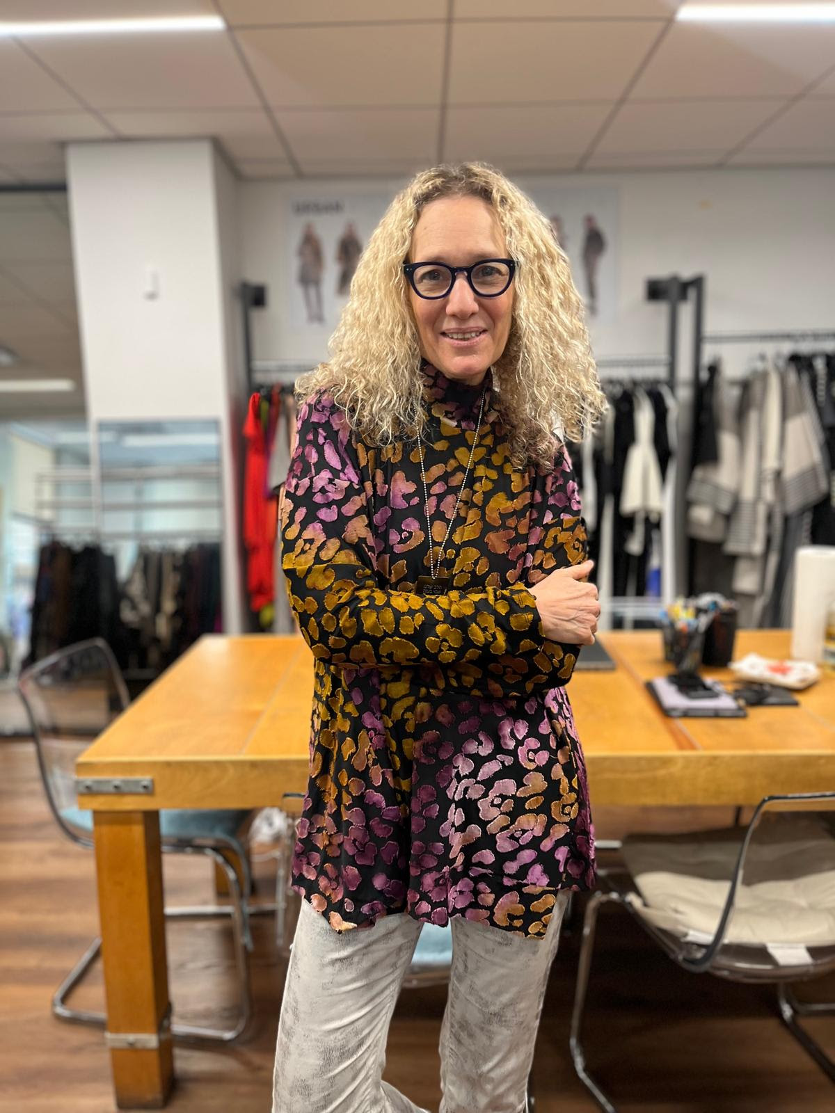 Yael is wearing Pallas Trapeze Top, Bloom and Iconic Stretch Jeans, Marble