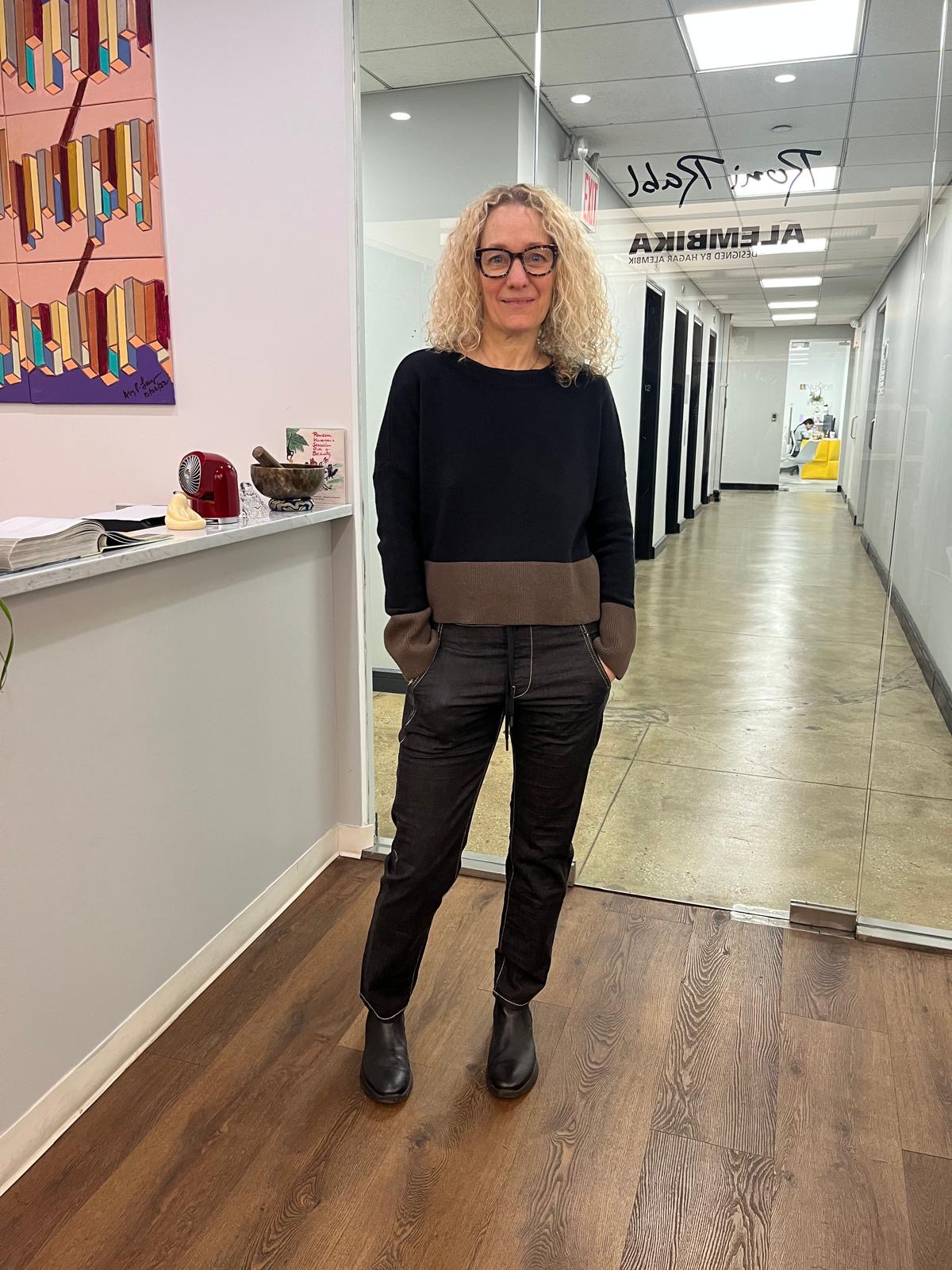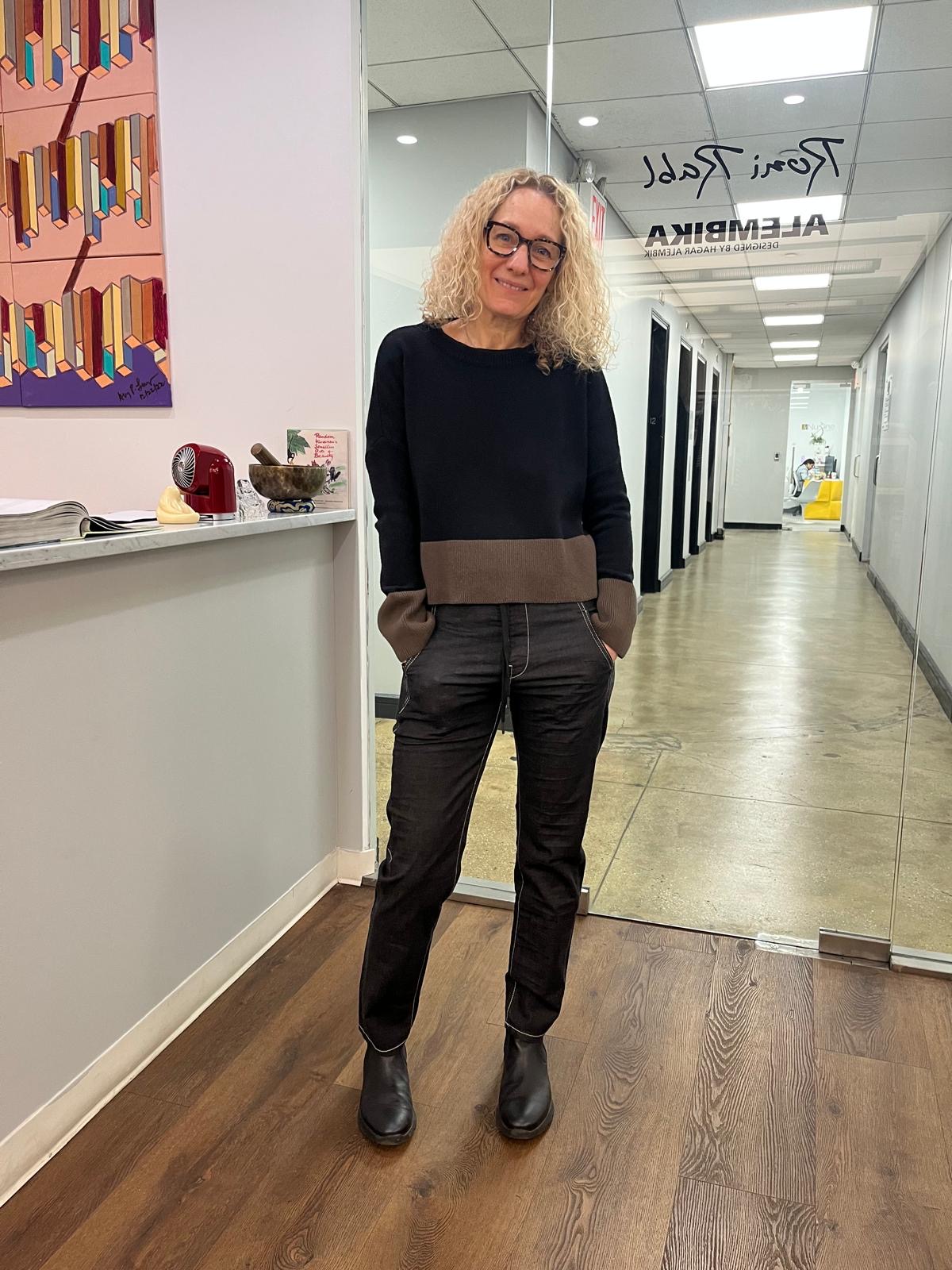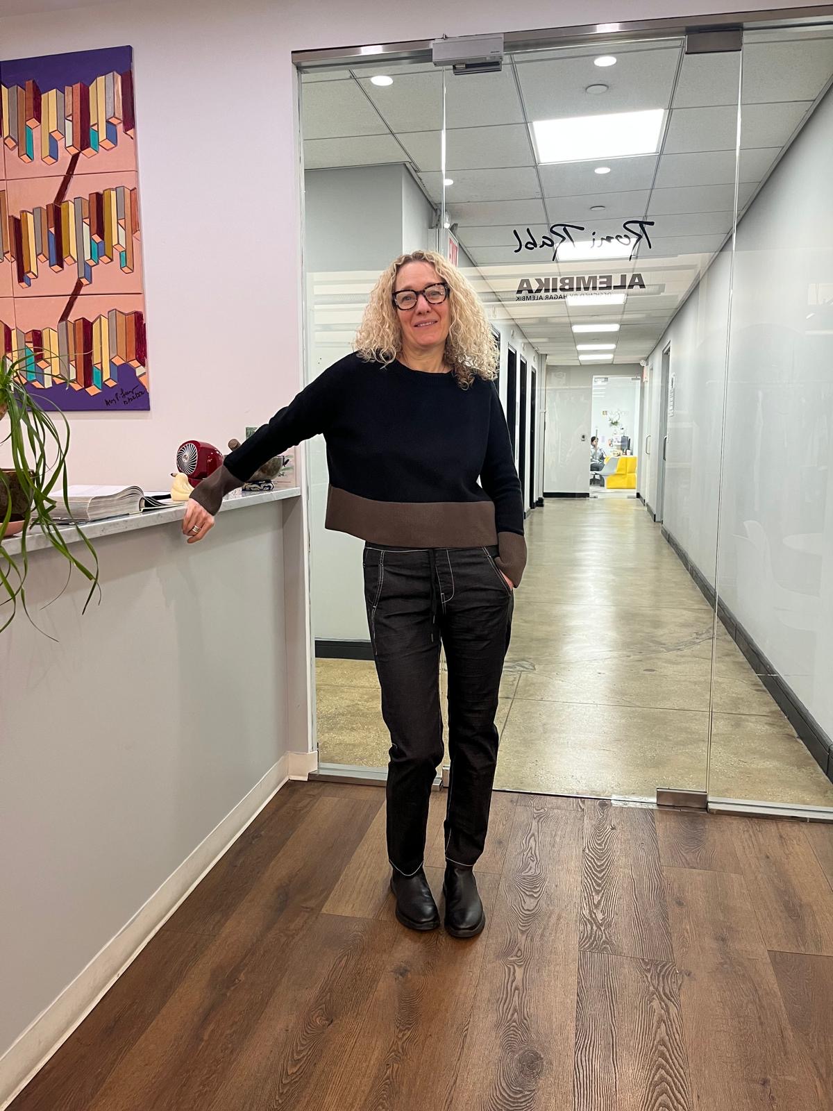 Yael is wearing the Vista Block Sweater in Mix (available in other color combos) and Urban Washed Iconic Stretch Jeans