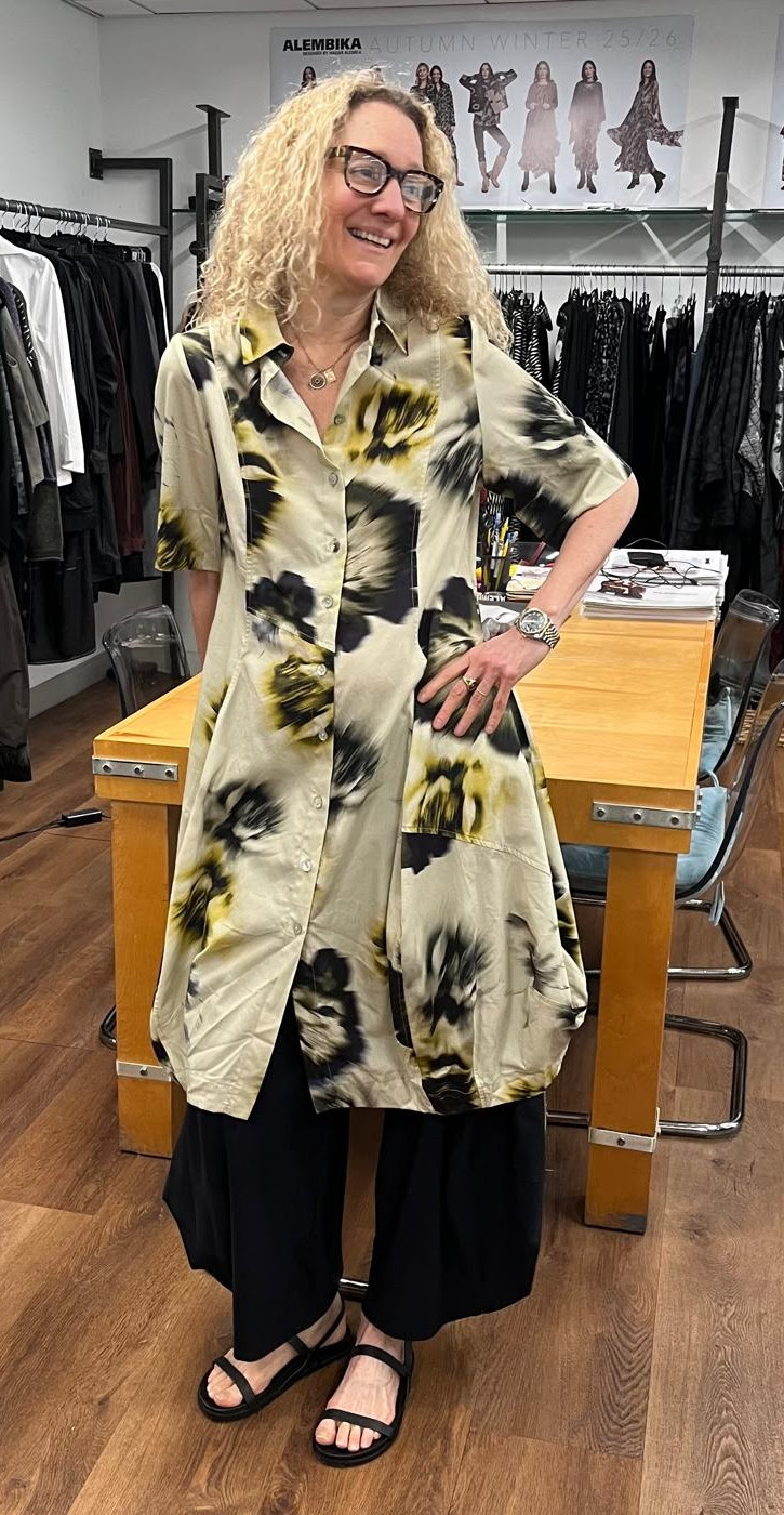 Yael is wearing the Barb Cotton Shirtdress in Pansy Floral and Essential Tekbika Pocket Punto Pants
