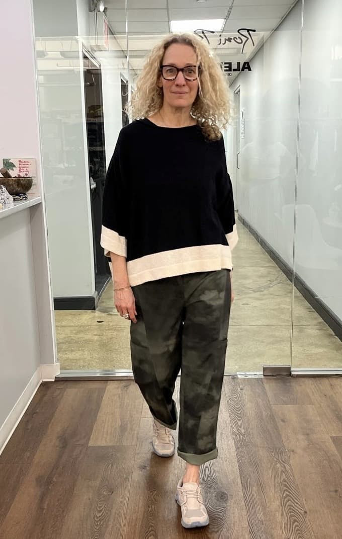 Yael in the Belle Sweater and the Cargo Trouser, Olive from Ozai N Ku.
