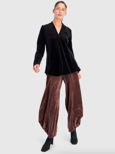 A black velvet tunic layered over wide-leg punto pants is a fresh alternative to a gown, while a sequin top with lantern pants becomes a power look for any evening occasion.