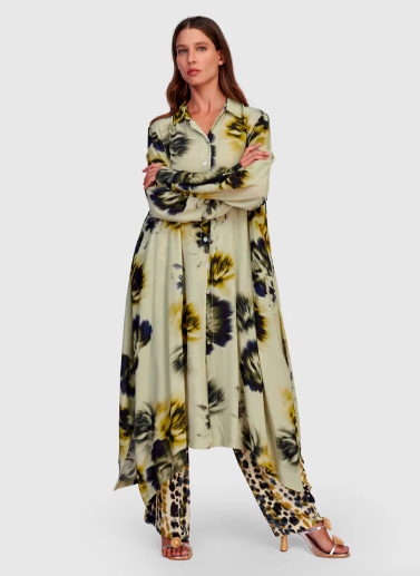 You can easily transition your look from day to night by adding a piece to evolve the look. Seen here is the Santal Shirtdress worn alone or styled two ways with the Eolian Straight Pants. The After Dark mix and match pieces are ideal for occasions that stretch across hours.