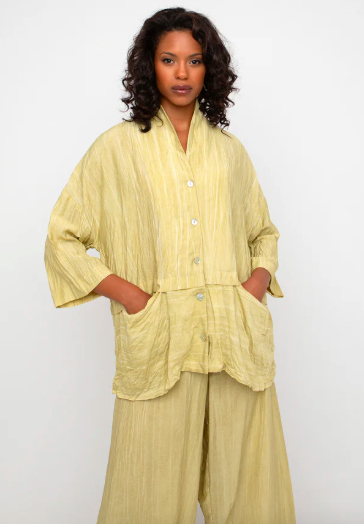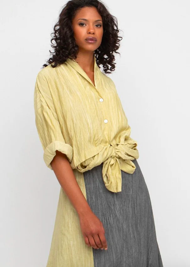 Capture the feeling of sunshine with pieces from Guest Designer Ozai n Ku’s Resort Collection: such as the flowy Ozai N Ku Greenwich Shirt in Butter Yellow layered over a dress or pants from the collection.