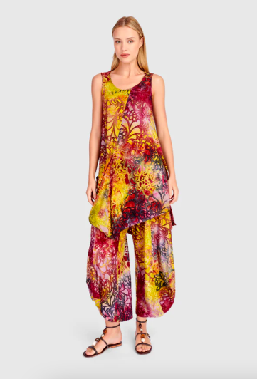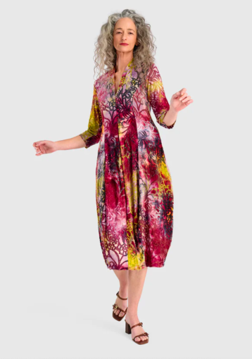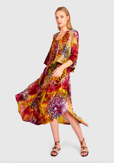 Evenings invite a softer, more refined approach to color. Rich tones, subtle prints, and fluid fabrics create modest spring dresses and spring tunic tops and punto pants that feel elevated without being formal. Layer with a cropped spring cardigan (such as the Kaleidoscope Cropped Cardigan in Raspberry Gold over the Cascade Tank Dress) for cooler nights, and let color do the talking. Left: Groove Punto Pants and Scattered Tunic Tank in Raspberry Gold. Right: Confetti Cocoon Dress in Raspberry/Gold. Shop Spring Colors.