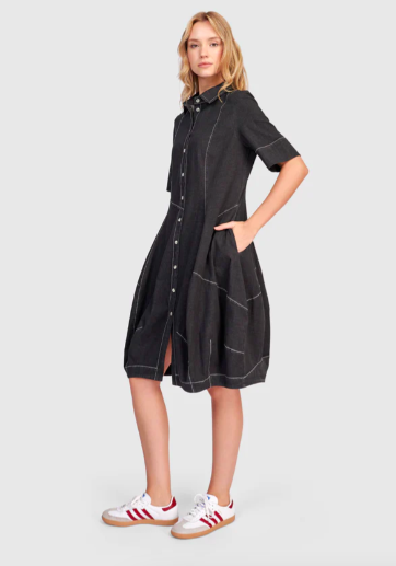 Embrace your flirty chic side with reimagined denim dresses in a variety of silhouettes. We are loving the Barbie Wonderful Shirt Dress (below) in Denim and Black Denim. This casual version of the signature Wonderful Dress is made in a lightweight denim woven and has a fold over collar, full button placket, elbow length sleeves, and side pockets. A slim fit that flatters, with signature draping, denim seam detailing and pouf skirt to hold shape. Fitted at the bust. If you’re between sizes, we recommend sizing up.