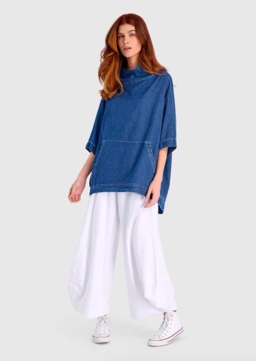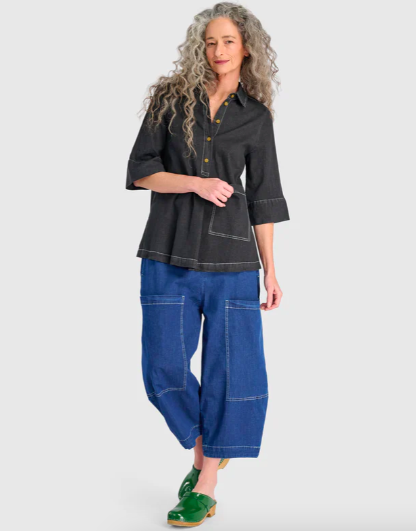 The Bold Barrel Capri Pants (left) is a fresh take on casual denim. The high-rise waist fits true while the voluminous leg adds a modern, sculptural feel. Extra-large patch pockets and soft stretch denim enhance their laid-back utility.
