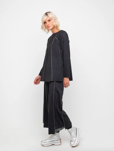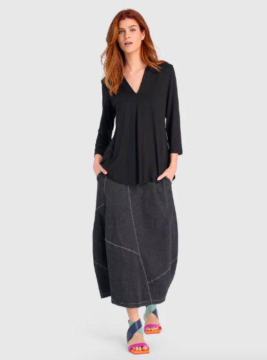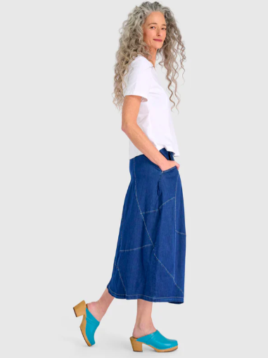 Carla Cocoon Skirt is a midi skirt with a cocoon shape that is subtly defined by contrast seaming and a taper at the hem. Comfortable with a flat front and elastic back waist, it’s an easy partner to boxy knits or tailored shirts.