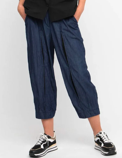 The barrel-leg Papaya Relaxed Pants (center) barrel-leg pants are crafted in soft denim with a hint of stretch. Features an easy pull-on waist, tapered hems and side pockets.