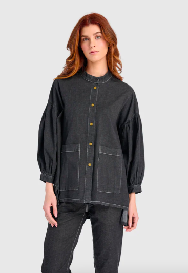 A denim top goes with just about any staple from your closet. The top row shows our Myles Popover Shirt (left) also in Black Denim, Penelope Puff Top (center) also in Denim, Perfect Pullover Top (right) also in Black Denim.
