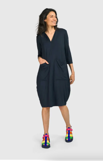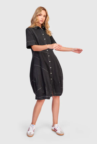 LEFT: Barbie Wonderful Shirt Dress, Black Denim CENTER: Urban Moxy Relaxed Dress, Brown RIGHT: Essential Cargo Dress in Ocean. Also available in Black and Red Rose.