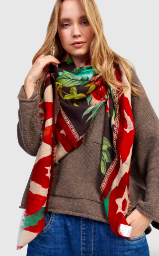 CENTER: Weekend Boyfriend Jogger Jeans in Denim, a Dance the Blues scarf layered over our Basis Pullover Sweater in Grey. The jeans also come in Black, Camel and Red. The pullover in Brown, Khaki and Red.