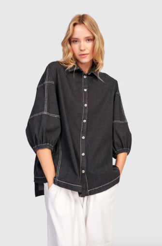 BELOW: Pippa Puff Blouse, Black Denim (left). Soft Knit Mockneck Tee seen here in Red. Also available in Cream and Black (right).