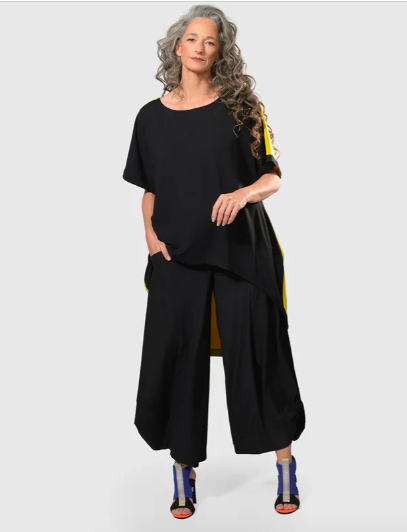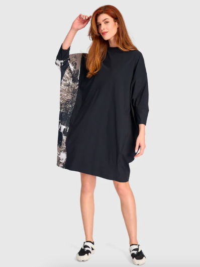 Tekbika Daisy Cocoon Dress – This signature Alembika silhouette has a slim fit that hugs the bust, then flares at the waist into a midi length with cocoon skirting. Made in a stretchy soft jersey knit with decorative panels in slinky, lightweight TECHNO fabric that give off a pop of color. V-neck, three quarter length sleeves, and in-seam side pockets finish off this chic dress. *Slim fit, cocoon silhouette, midi length.
