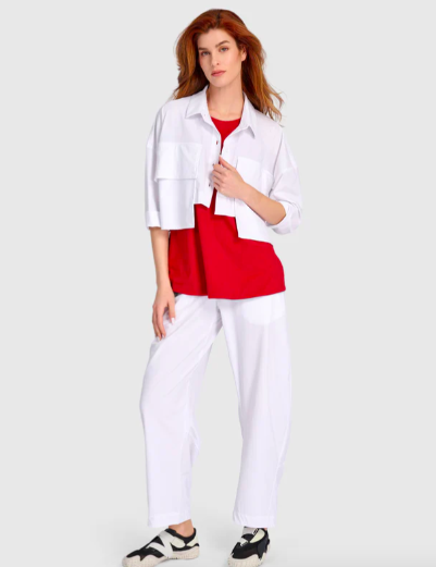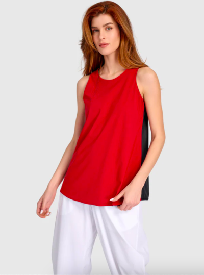 Dozens of black, white, red and combo colored pieces empower you to make a million different looks out by mixing and matching. For example, start with the Essential Tekbika Slim Barrel Pants in white (also in black and in red) then pair with the Essential Reversible Tank (choose the red side or the black).