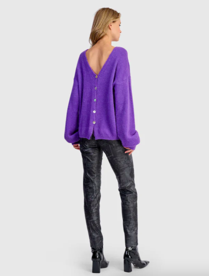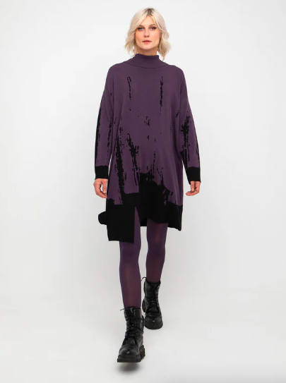 Left: Essential Heavyweight Turtleneck Dress in Grey (also in Black). Center: Essential Tekbika Pocket Punto Pants in Black. Right: Chacha Reversible Cardigan in Purple (also in Black).