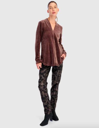 Everyday Velvet V-Neck in Sepia (left), Aya Velvet Trapeze Top (center), and our low-in-stock Starlet Velvet Leggings (right).