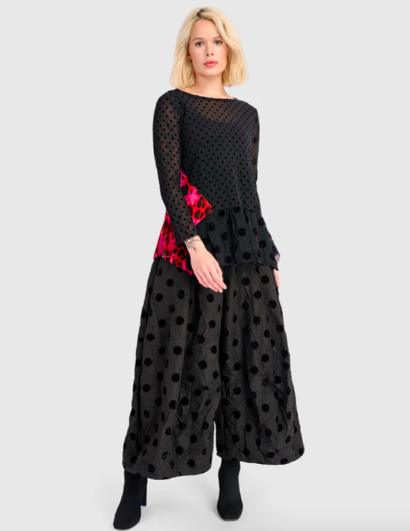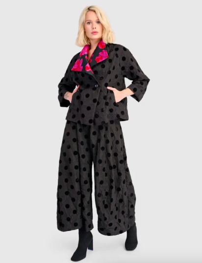 The Cherie Cocktail Jacket and Pois Barrel Pants are stunning for cocktail parties, while the wide-leg trousers paired with the Amour Flounce Top creates an easy, elegant dinner look.