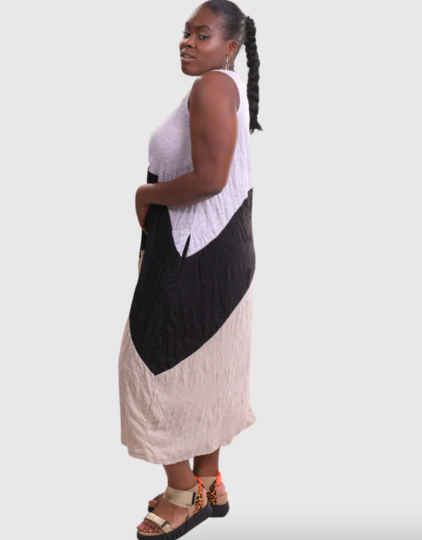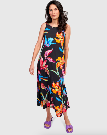 - Dress: Breeze Crinkle Maxi Dress, Multi – sleeveless crinkle knit, roomy swing silhouette with side pockets. Effortlessly breathable and wrinkle‑resistant—a perfect summer swing dress for modest summer clothing fans. Size 8 available.