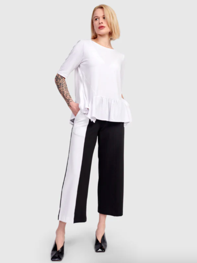 - Top + Pants: Olivia Lounge Pants and Addison Flouncy Tee (available in white or black) create a classic black and white summer outfit for women over 50. (Read Summer Style Guide to Wear Every Season).