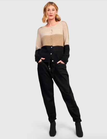 Pictured above: Trucker Cardigan and Python Wide Leg Stretch Jeans Boa (left), Sloane Cardigan and Boyfriend Jogger Jeans (center), Chacha Reversible Cardigan in Black (right),