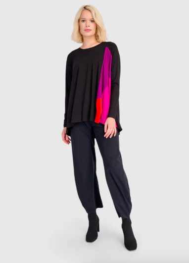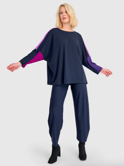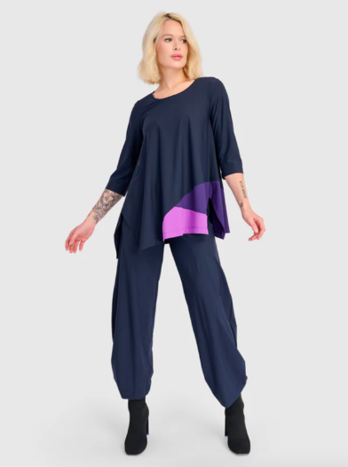Try: A two-piece set or layered tunic and pants — polished, flexible, and easy to mix and match. See here are Tekbika Geranium Top (left), Tekbika Iris Top (center), Tekbika Azalea Swing Top (right) all paired with Tekbika Flow Pants available in Midnight, Forest, Wine.