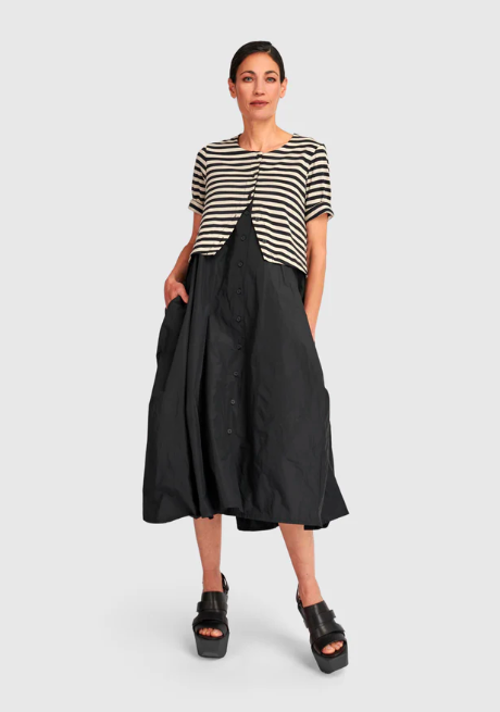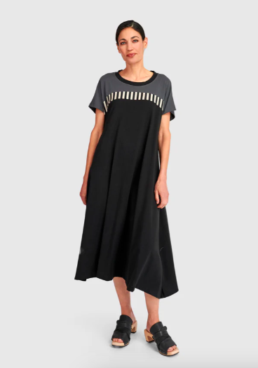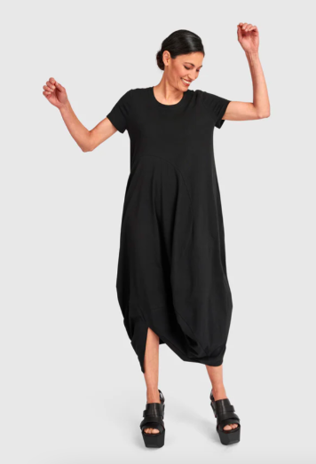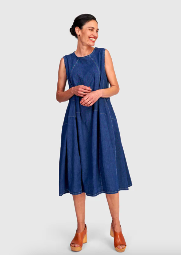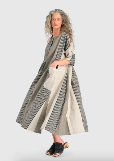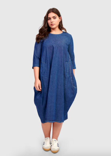 Alembika celebrates shape and individuality. From architectural hems to fluid draping, these spring outfits for older women are designed with proportion and comfort in mind. Left: Liberty Oversized Shift Dress (also in black denim). Center: Mystere Camp Shirt. Right: Urban Maxima Crew Cocoon Dress.