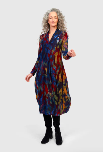 Seen here Sunburst Cocoon Dress, Alembika’s signature silhouette also in many colors, fabrics and patterns.
