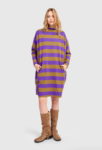 When you wrap yourself in a dress that moves with you, not against you, your body registers it as safety. Muscles release tension. Breathing becomes more natural. There’s a sense of being both feminine and powerful—strong yet open. Urban Striker Tee Dress is seen here.